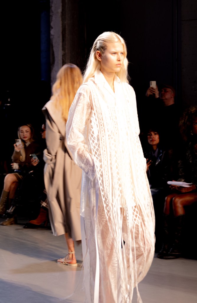 Le rendez-vous était donné dans l’espace du Saut du Loup au Palais de Tokyo, décor brut et lumineux qui laissait toute la place aux silhouettes imaginées par Mitsuru et Aco Nishizaki. Une fois de plus, Ujoh nous transporte ailleurs, au Japon, terre d’inspiration de la maison, où l’été n’est plus synonyme de fraîcheur mais d’une chaleur dense, presque étouffante.