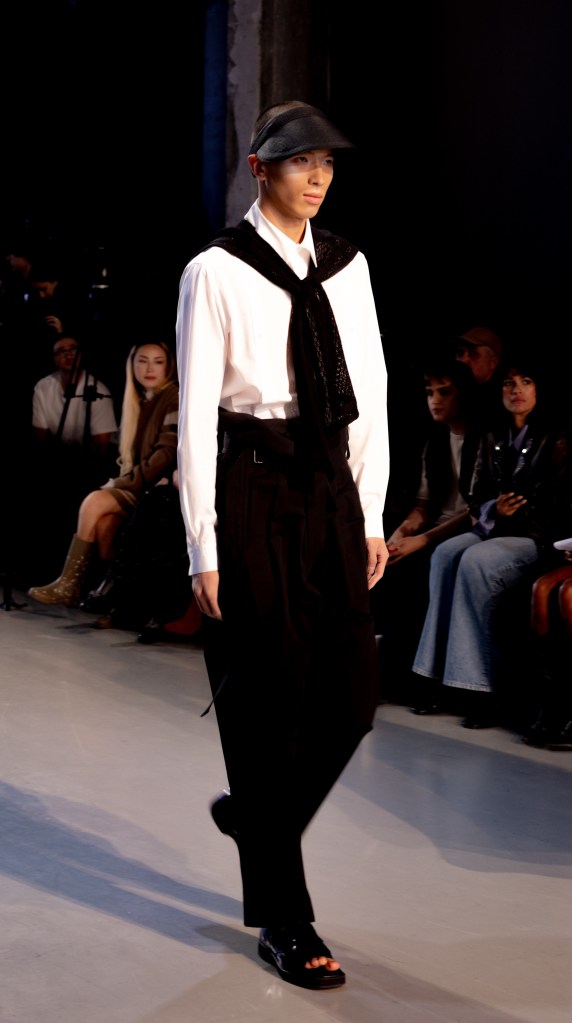 Le col marin, revisité, devient une structure protectrice posée sur les épaules. Les volumes amples permettent à Ujoh de réinventer son layering signature, non plus comme une superposition dense, mais comme une respiration. Une manière de styliser la chaleur plutôt que de la subir.