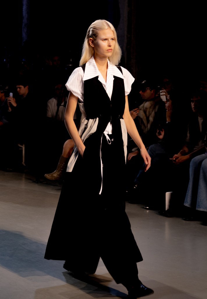 Lorsqu’on pense à l’été, on imagine la légèreté, les couleurs vives, les tenues qui s’effacent presque sur la peau. Ujoh, lui, choisit la lucidité. La collection propose une raison élégante de porter encore des pantalons , certes amples, mais parfaitement justifiés. Les designers imaginent un véritable « uniforme d’été » : léger, ingénieux et d’une sobriété raffinée. Les tuniques et jupons bleu pâle rappellent les vagues qui s’entrelacent, tandis que les coupes flottantes semblent pensées pour capter le moindre souffle d’air.