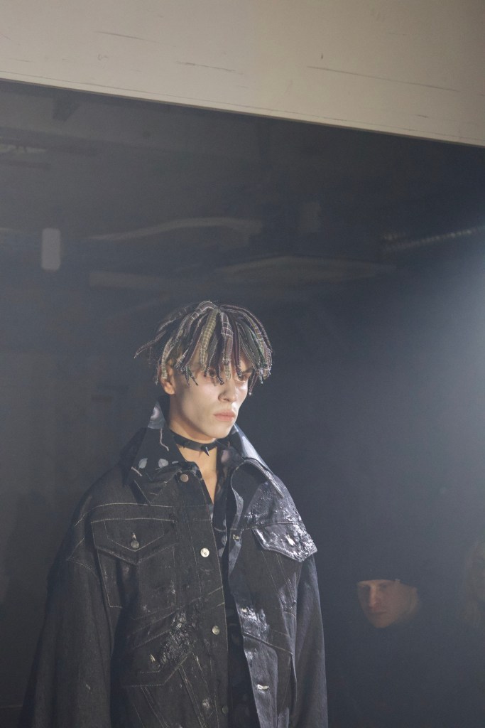 Côté palette chromatique, on est loin des couleurs flashy aperçues lors de la précédente collection ou proposées par d’autres maisons cette saison. Hiroaki Sueyasu privilégie des tons fumés : kaki, gris, noir dominent. Quelques motifs et des touches de rouge apparaissent, mais sans jamais rompre l’équilibre. La tension ne passe pas par la couleur, mais par les matières et les superpositions. C’est sans doute ce qui rend l’ensemble si cohérent. Le créateur tente d’insuffler de la poésie dans le chaos qu’il met en scène, et cela transparaît dans plusieurs silhouettes. Il ne se revendique pas ouvertement punk : il en prélève certains codes pour mieux les transformer. Il les réinterprète avec la poésie et la sensibilité artistique qu’on lui connaît. Finalement, KIDILL résiste à l’évidence et refuse toute lecture trop littérale. La marque s’impose une fois encore comme un espace de tension maîtrisée, où le désordre devient langage esthétique.