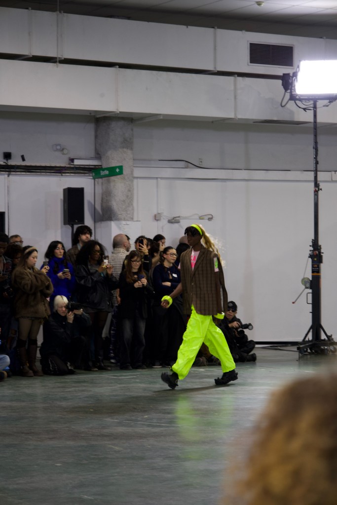 L’art du layering est une nouvelle fois mis à l’honneur lors de ce défilé haut en couleur. Walter Van Beirendonck souhaitait absolument que formes ludiques et références rugueuses cohabitent. Dans cette collection, on retrouve des pièces évoquant des armures, comme les blousons ou certaines structures enveloppantes. Ces éléments se mêlent harmonieusement à des motifs militaires et à des références au vestiaire enfantin, visibles dans les sacs, les imprimés ou encore les fleurs en 3D. Chaque silhouette reste transformable et modulable, jouant avec les codes : certains éléments apportent une légère agressivité, tandis que d’autres insufflent de la tendresse. La palette, bien que parfois froide — un rappel de l’hiver — ne limite pas l’expressivité de la collection. Walter Van Beirendonck veut un vestiaire flamboyant et coloré, où accessoires, motifs et détails ponctuels introduisent des couleurs saturées. C’est cette dualité entre rigueur et fantaisie qui permet au directeur artistique de pousser sa réflexion et de donner toute sa profondeur à la collection.